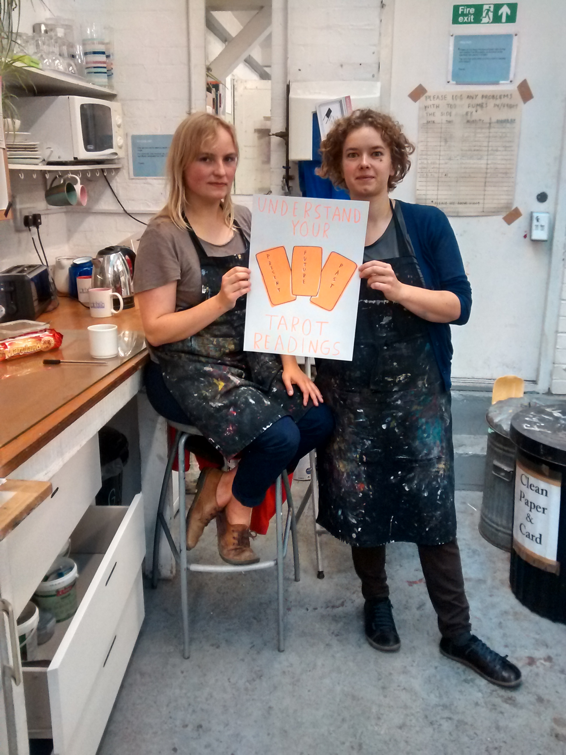 Rosalie and Jo collaborating to make posters for Tarot Readings and The Stone of Wisdom at Inland Art Festival